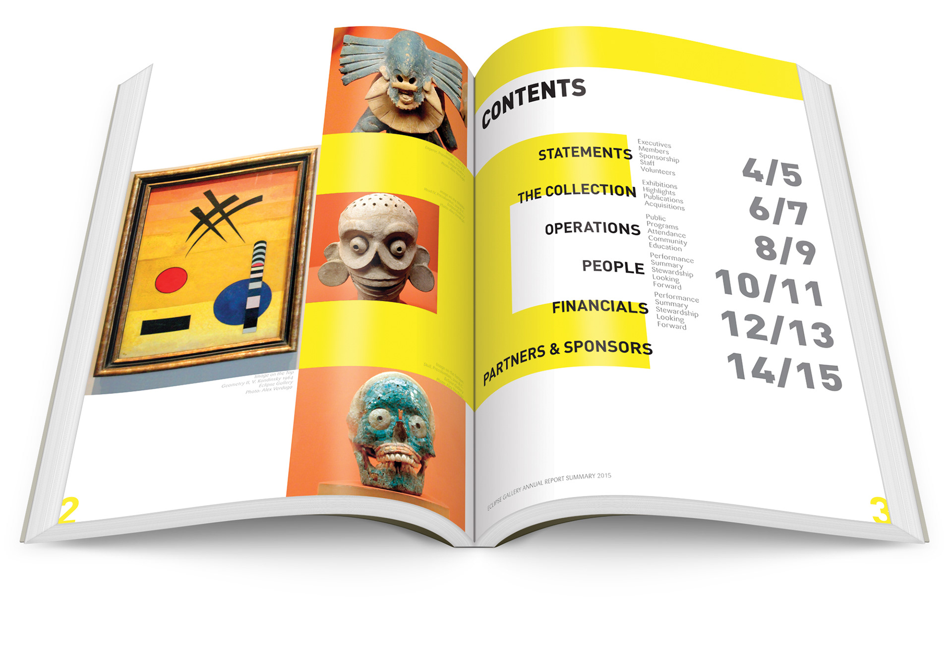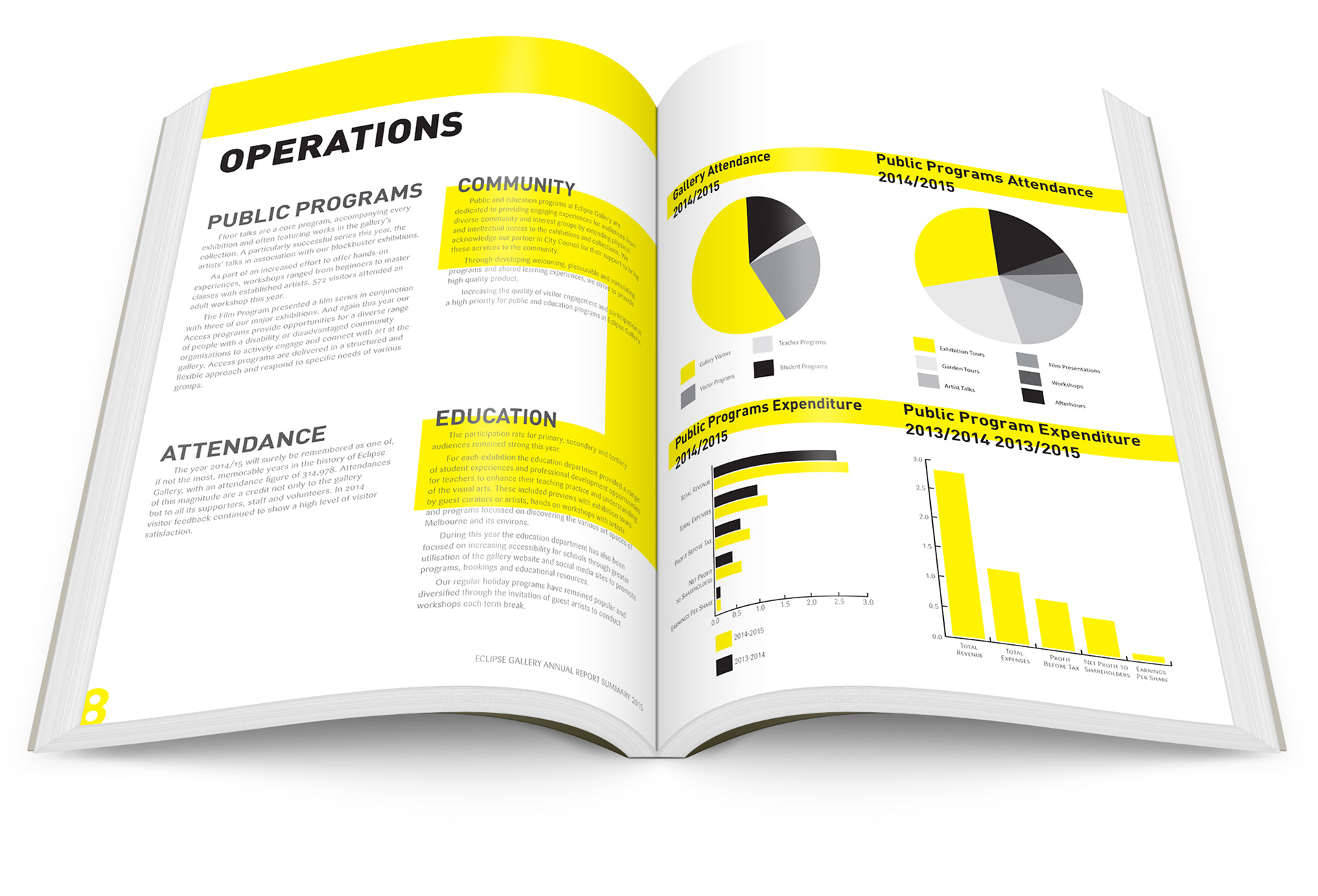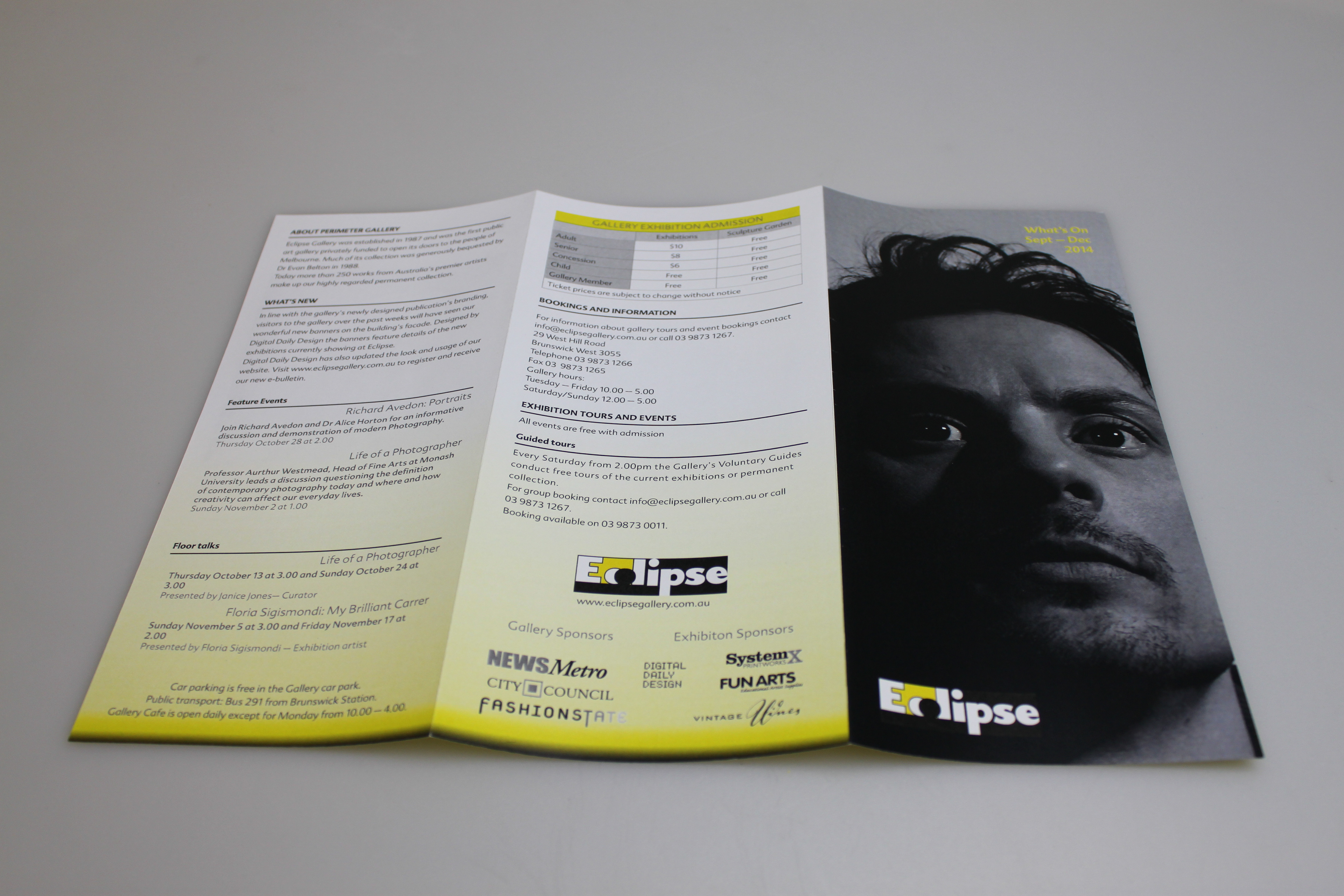 Eclipse needed a 3-fold brochure to attract new visitors, featuring provided text, artist names, and photographs, along with a layout for an annual report.
