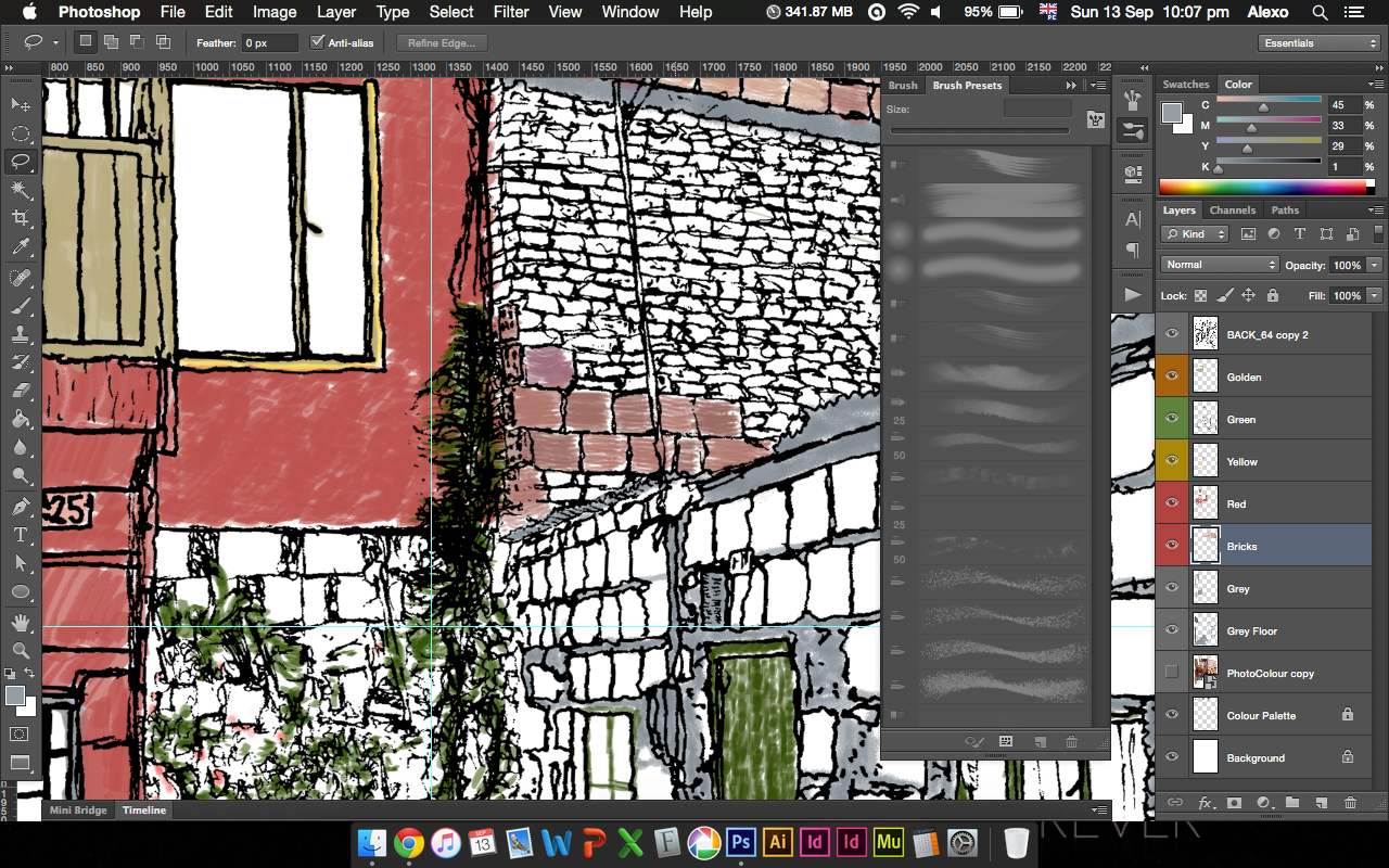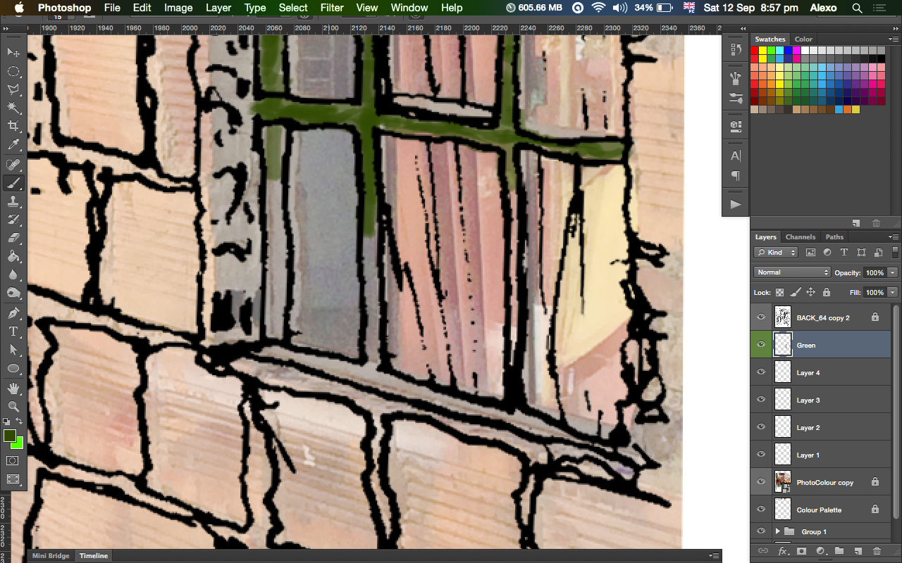 Initial line tracing. I did it in two parts as I found easier to scan them separately for further colorings using layers in Adobe Photoshop