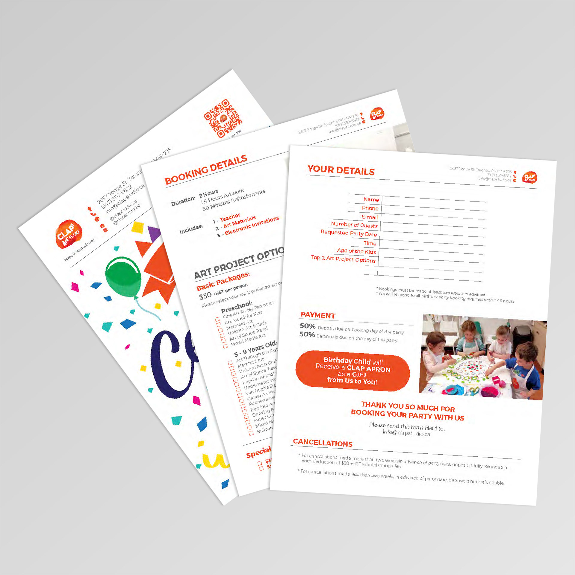 Designed a clear, parent-friendly booking and information set for CLAP Art Studio’s birthday parties. The layout organizes schedules, pricing, project options, and payment details into an easy-to-follow format, balancing playful visuals with practical clarity. The goal was to simplify the booking process while keeping the brand warm, creative, and trustworthy for parents.