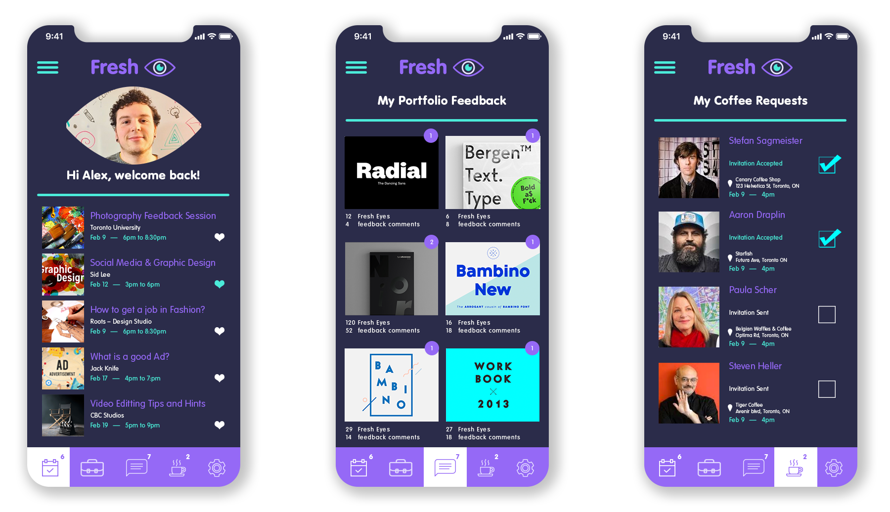 The FreshEye app features a user-friendly interface with key screens: Profile, Portfolio Feedback, and My Coffee Request. Users can interact with mentors, receive portfolio critiques, and even buy a mentor a coffee for personalized feedback.